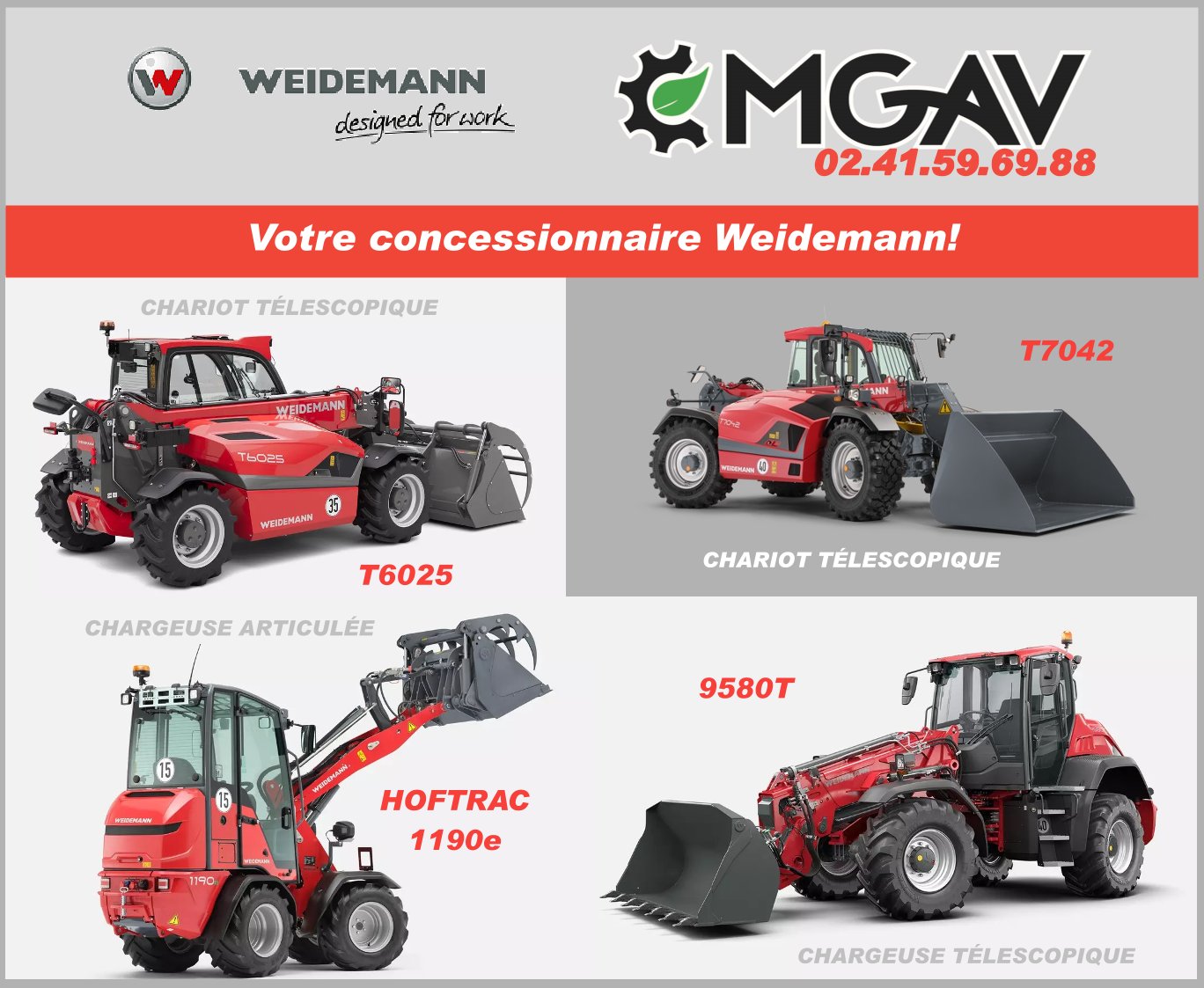 MGAV est concessionnaire officiel de la marque allemande Weidemann. Notre équipe formée aux spécificités Weidemann est à votre disposition pour vous accompagner dans le choix de votre équipement et vous conseiller.